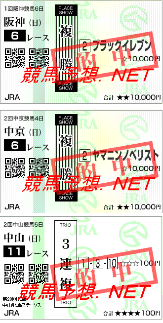 4/3【土】 ------ --- ------------------ ------ ------- 場所 R 馬名 着順 複勝 ------ --- ------------------ ------ ------- 中山3 1 マイネルナロッサ 6着 中山3 11 ベイリングボーイ 7着 阪神3 4 ライブリシュロム 1着 140 阪神3 4 ワイズプロローグ 5着 ------ --- ------------------ ------ ------- 4/4【日】 ------ --- ------------------ ------ ------- 場所 R 馬名 着順 複勝 ------ --- ------------------ ------ ------- 中山4 4 リアライズトロイカ 3着 170 中山4 10 カフェレジェンド 14着 阪神4 10 ショウナンライジン 12着 阪神4 10 テイエムアンコール 1着 290 ------ --- ------------------ ------ -------クリクリ願います↓