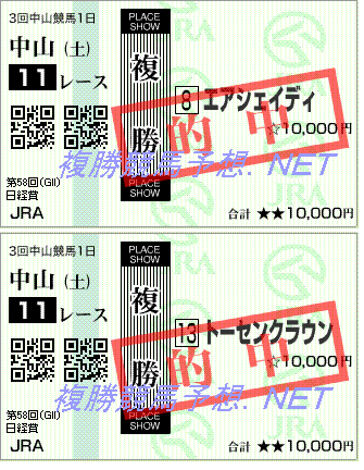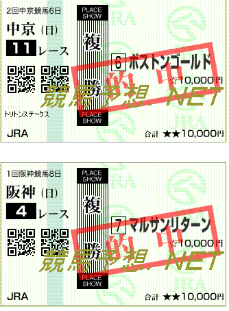 4/17 ------ --- ------------------ ------ ------- 場所 R 馬名 着順 複勝 ------ --- ------------------ ------ ------- 中山7 11 ドールリヴィエール 4着 中山7 11 ギルティストライク 8着 阪神7 4 オメガキングコング 14着 阪神7 10 タマモナイスプレイ 6着 ------ --- ------------------ ------ ------- 4/18 ------ --- ------------------ ------ ------- 場所 R 馬名 着順 複勝 ------ --- ------------------ ------ ------- 中山8 5 ロトディパーチャー 5着 中山8 9 ノーフォークパイン 11着 阪神8 11 マームードイモン 7着 ------ --- ------------------ ------ -------
